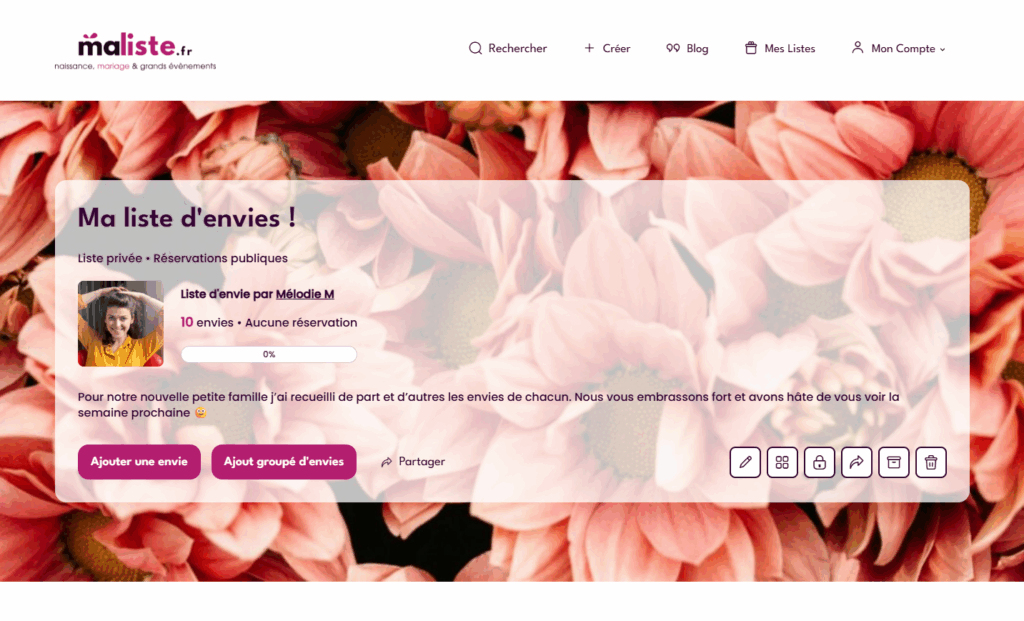 Avec maliste.fr, créez et partagez gratuitement votre liste de cadeaux qui accompagnera tous vos plus grands moments.